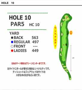 10番ホールは497ヤードのやや右ドックレッグのロングホール。左側ががけになっており、1打目はフェアウェーセンターやや右側が狙い目。