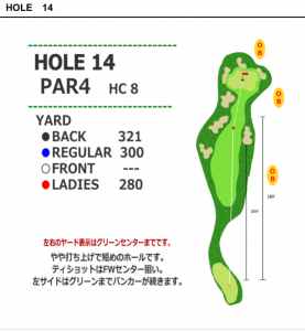 14番は301ヤードの距離の短い右ドックレッグのミドルホール。打ち上げになっており、1打目の落下地点が見えない。フェアウェー左側はバンカーが続いているので、ティーショットはフェアウェーセンターが狙い目。