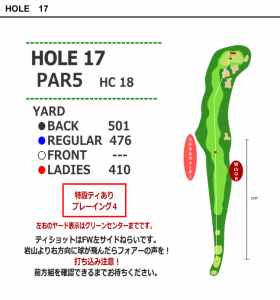 17番は476ヤードのロングホール。1打目は打ち下ろしになるが、2打目は打ち上げになります。ティーショットはフェアウェーセンターより左側が狙い目。