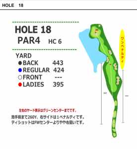 18番の最終ホールは池がからむ名物ホール。距離は424ヤードと長いミドルホール。ティーショットは左前方にある池まで260ヤードのため、フェアウェー右側の方2打目が打ちやすいため狙い目。右側がワンペナになります。
