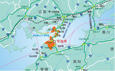 今治市は愛媛県北東部にあり、バスや電車では松山空港から1時間10分(接続の時間含む)。松山駅から40分の近さです。